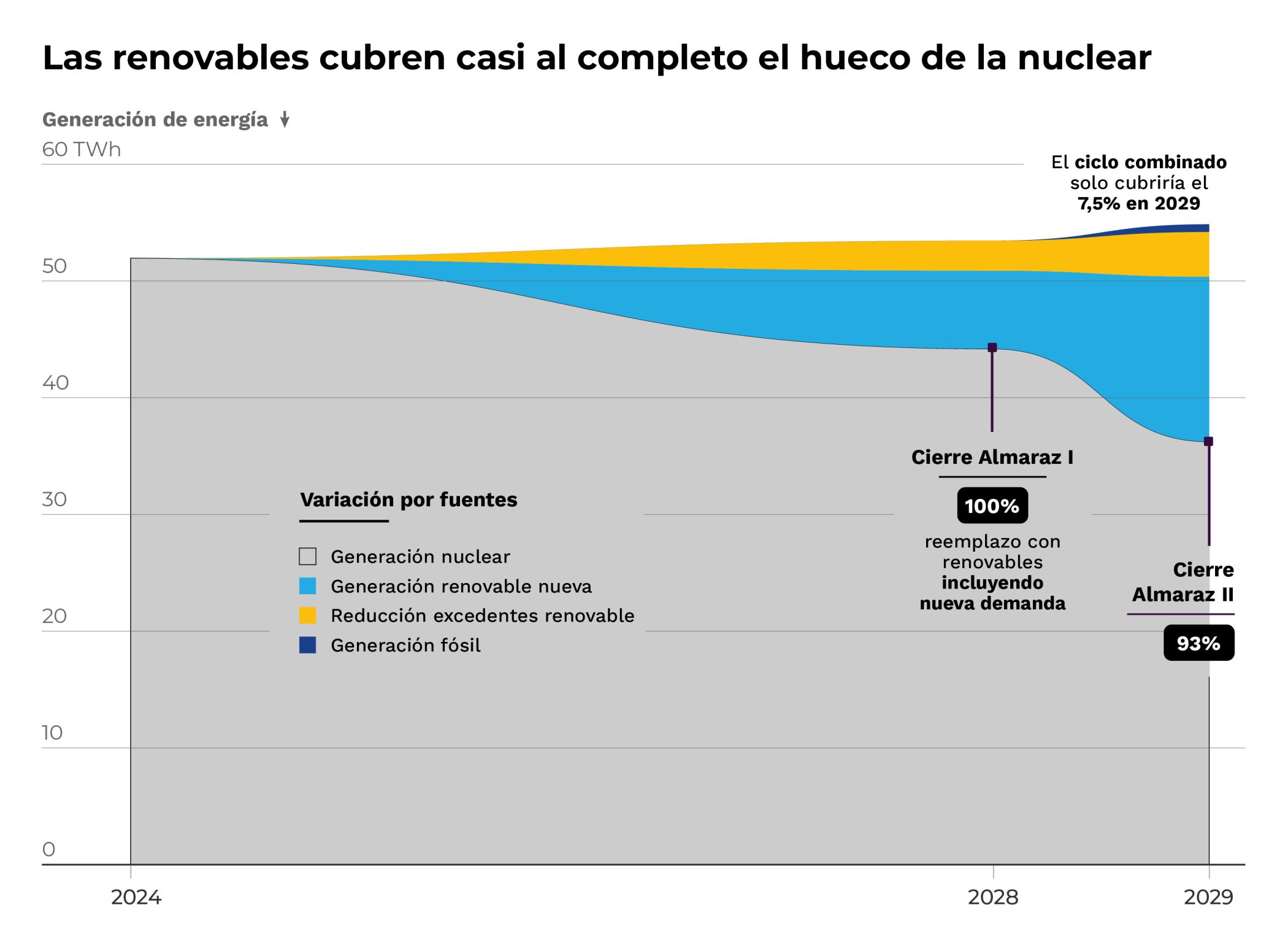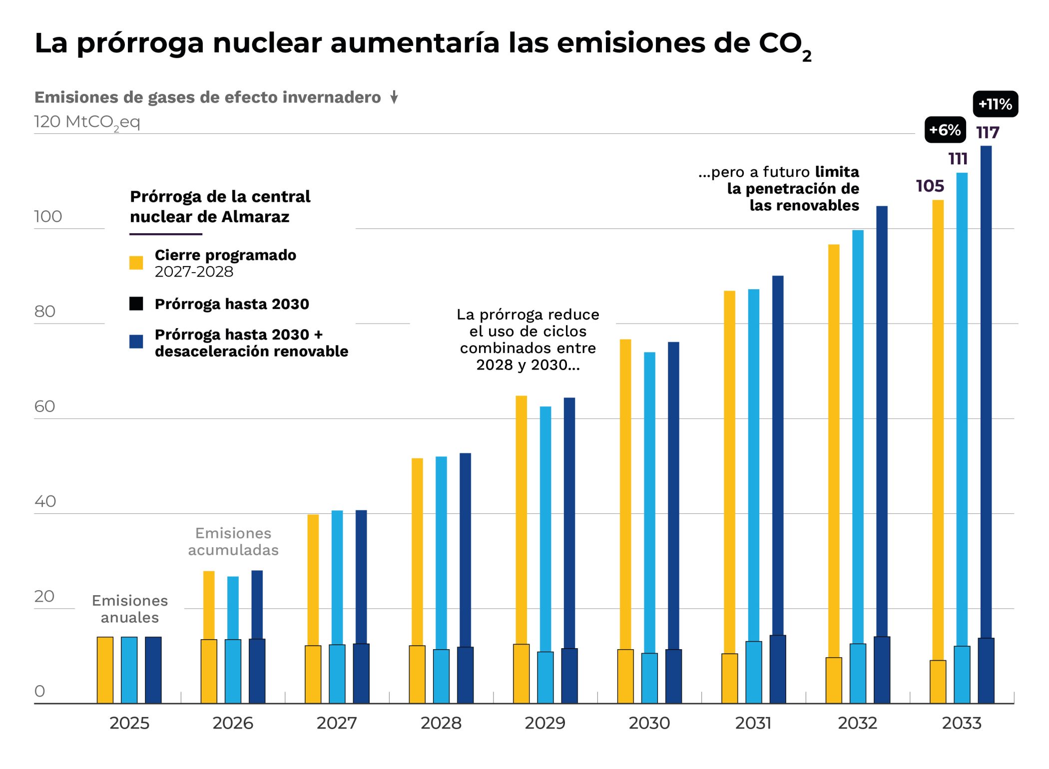 El informe analiza qué pasaría si la central nuclear de Almaraz se mantiene en funcionamiento hasta 2030, en vez de cerrar sus dos reactores uno en 2027 y el otro en 2028. Pasaría lo mismo que en las películas: todo el esfuerzo se centrará en mantener a raya los dinosaurios. Aunque la extensión de vida sea solo tres años más, el estudio estima que supone perder 26.129 millones de euros de inversiones en energía renovable y que los consumidores paguen un sobrecoste de 3.831 millones de euros en la factura de la electricidad.
