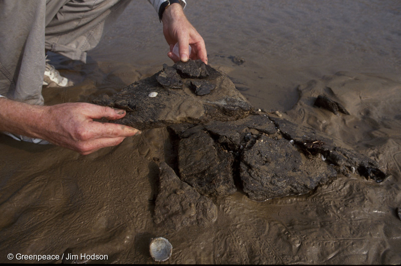 1991: Greenpeace realiza un estudio sobre la contaminación petrolera de la Guerra del Golfo en Irán. Se observan barcos destruidos durante la guerra Irán-Irak a lo largo del río Khorram. © Greenpeace / Jim Hodson