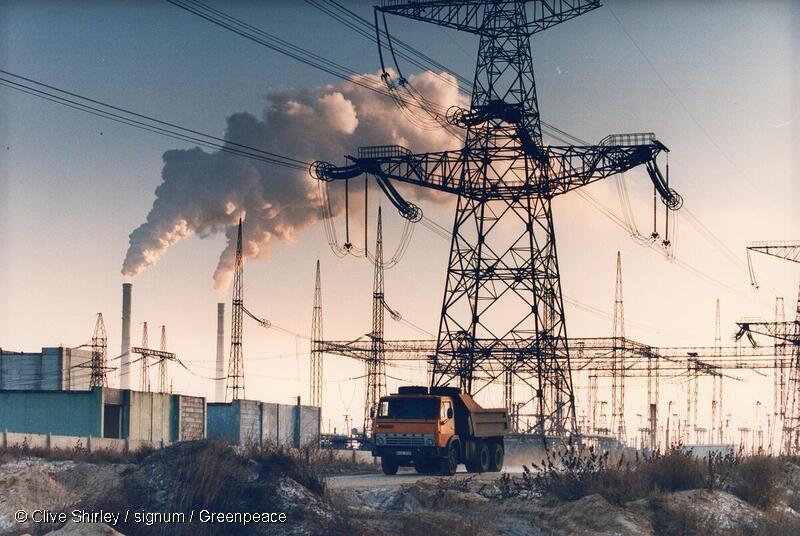 Central nuclear de Zaporizhzhia en Ucrania. Torres de alta tensión en la central nuclear de Zaporizhzhia, cerca de Ernergodar, en Ucrania. © Clive Shirley / Greenpeace