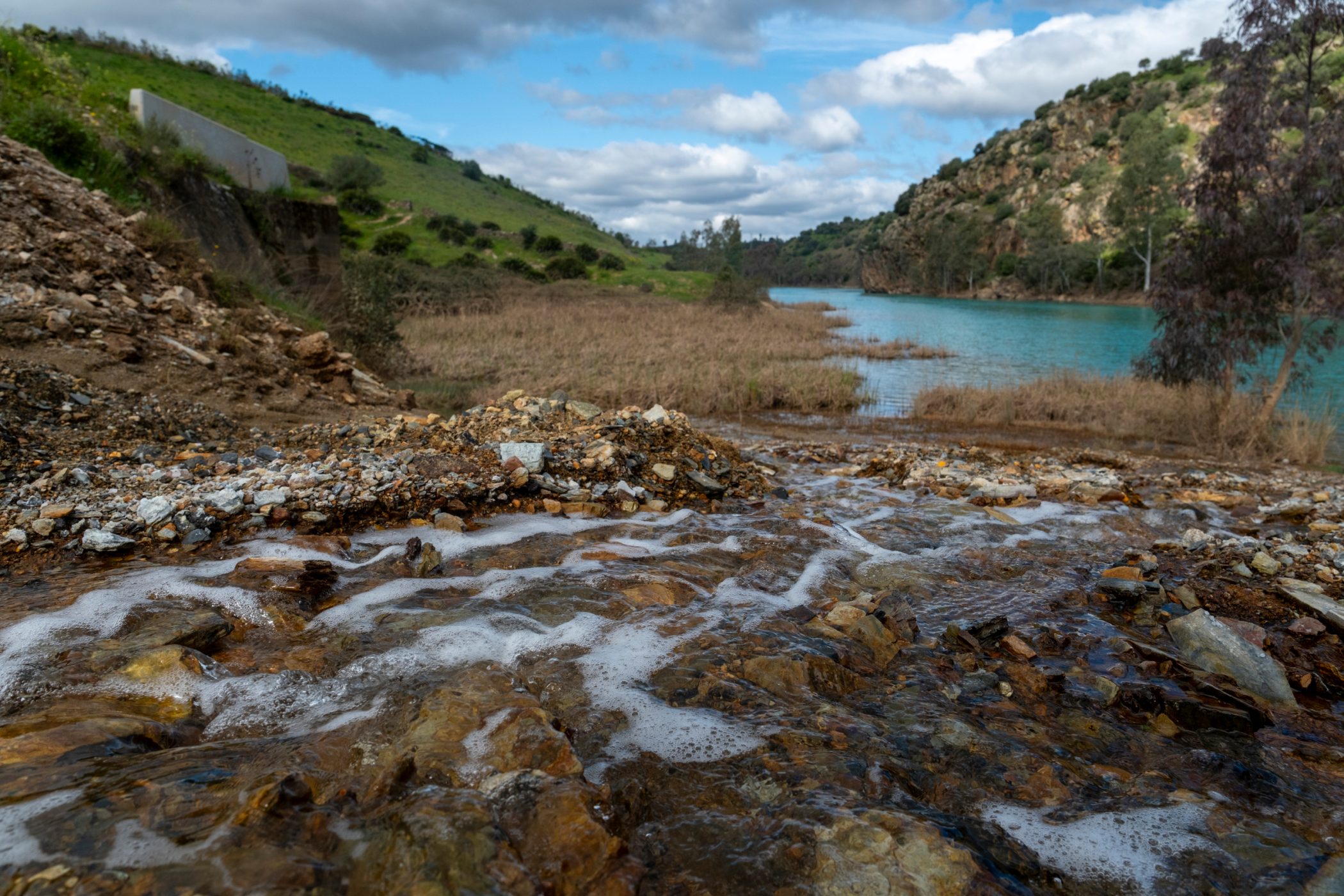 - Aguas color turquesa en el contraembalse del Agrio en las que se ve entrando agua contaminada por metales pesados que se drena de la corta de Aznlacóllar.